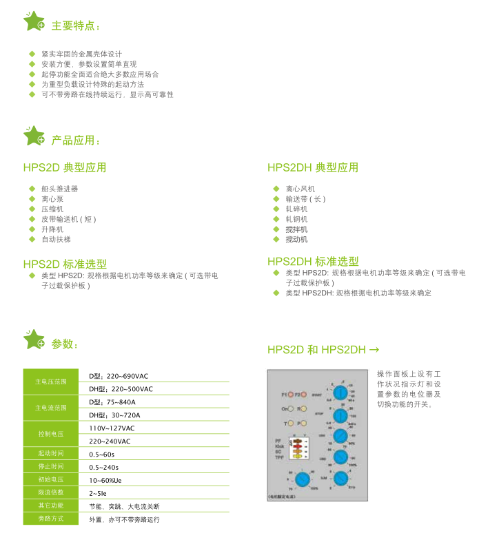 HPS2D75...840HPS2DH30...720 軟起動(dòng)器均有著堅(jiān)固的金屬殼體設(shè)計(jì),可分別適用于常規(guī)負(fù)載和重型負(fù)載的各種應(yīng)用場(chǎng)合它結(jié)構(gòu)牢固緊湊,安裝方便快捷。所有參數(shù)和功能選項(xiàng)均通過(guò)前面板上的調(diào)節(jié)電位器和功能切換開(kāi)關(guān)來(lái)設(shè)定和選擇。直觀清晰,各工作階段和狀態(tài)及故障均有相應(yīng)LED 指示讓用戶(hù)一目了然。特設(shè)節(jié)能功能,當(dāng)電機(jī)運(yùn)行在空載或輕載時(shí)自動(dòng)降低負(fù)載電壓,