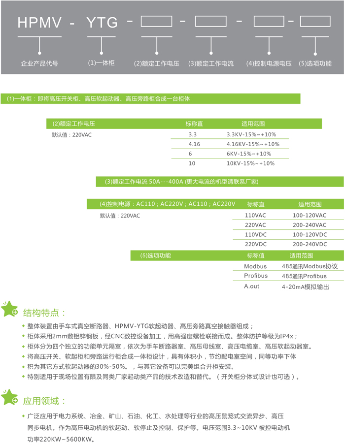 ◆ 整體裝置由手車式真空斷路器、HPMV-YTG軟起動器、高壓旁路真空接觸器組成;